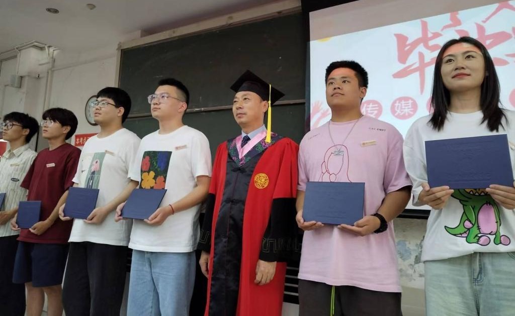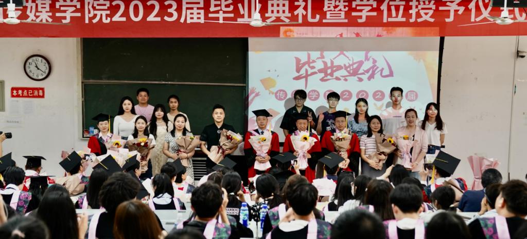黎峰书记向广播影视节目制作专业、播音与主持专业、广告学专业、网络与新媒体专业毕业生代表颁发毕业证书,张帅旗经理向广告学专业、网络与新媒体专业员工代表颁发学位证书,学院学术委员会成员黎峰、张帅旗、丁雪艳、袁培尧、张林贺、金荣洲、冯美、范选伟、为毕业生代表拨穗正冠。各专业员工为黎峰、张帅旗、董华丽、丁雪艳、范选伟、崔军彦 王雯、孙虓、毛永明鲜花。